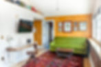 This spacious room features a sky light above a king bed, a cozy day bed with a standard twin mattress, WiFi and a flat screen television with AppleTV. Step into the closed-in porch room bathed in sun or moonlight to find a handmade leather-topped writing desk, a café corner and floor to ceiling drapes between the two spaces to add privacy. It highlights a modern vanity against a wall revealing 200 hundred year old handmade bricks. The private bath has a stone slab floor and a rain-shower.